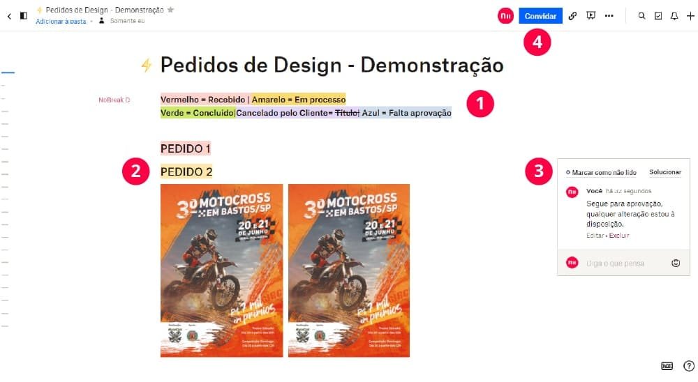 Toda sua lista de pedidos estará disponível no Paper do Dropbox, você poderá acompanhar todo o processo de desenvolvimento de cada pedido e preview para aprovação.