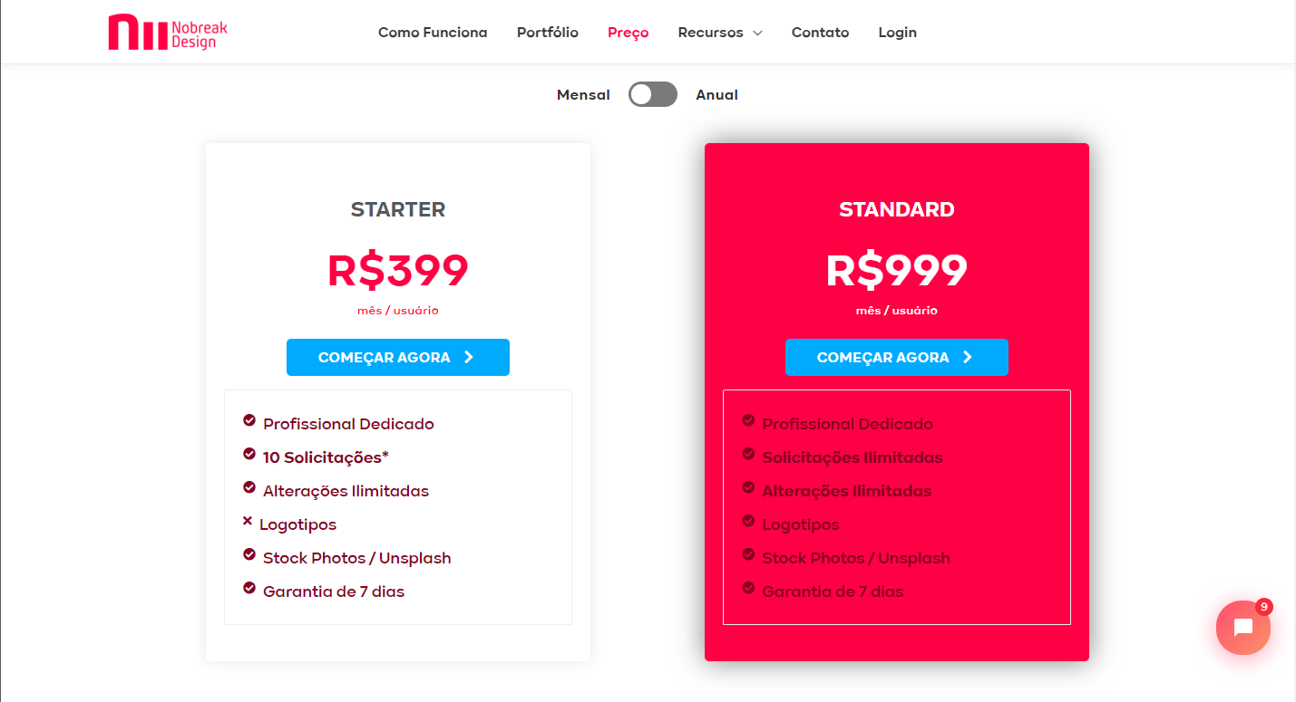 Starter: Você terá um pacote de 10 pedidos de design mensais, com um designer profissional dedicado, alterações ilimitadas e stock de fotos premium.